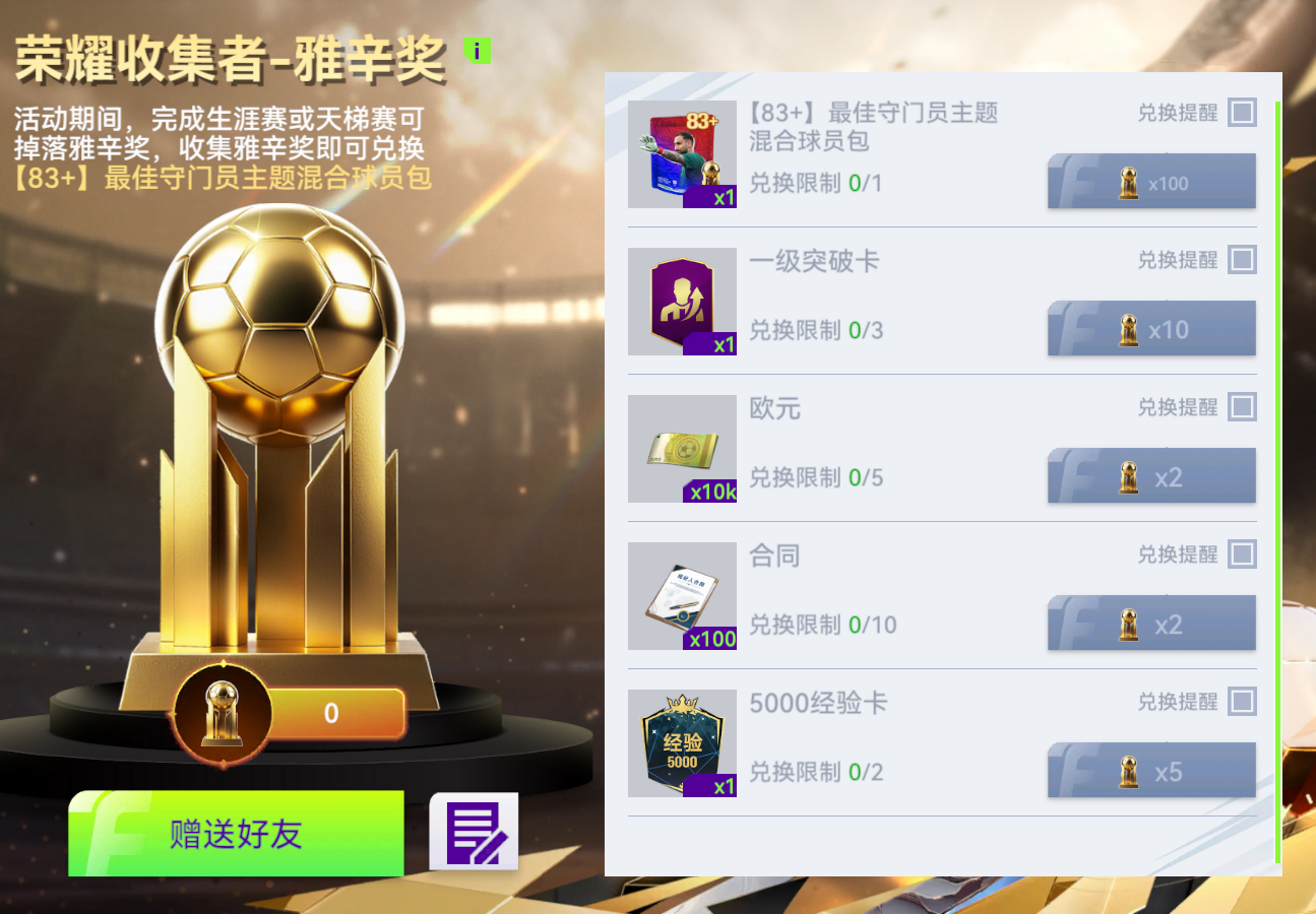 完成生涯赛或天梯赛可掉落雅辛奖杯,收集雅辛奖杯奖即可兑换【83+】最佳守门员包。门将是守护球门最后一道屏障,雅辛的名字也永远被刻进历史。现在,各位主帅也有机会用奖杯兑换属于自己的“守护之神”!收集荣耀奖杯,为你的球队打造稳如磐石的防线!