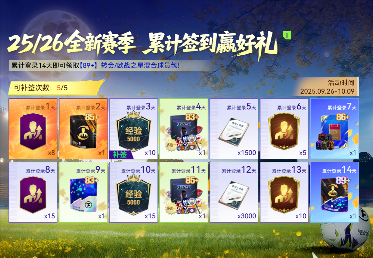 9月26日至10月9日期间内累计登录即可领取包含【89+】转会/欧战之星混合球员包、【85+】25/26赛季豪门自选球员包在内的诸多好礼!全新赛季的福利千万别错过!签到越多,收获越丰厚。参与活动占据制胜先机,说不定你就是那个最先脱颖而出的“新赛季黑马”!