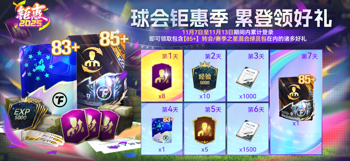 无需鏖战赛场,只需每日上线,就能将【85+】转会/赛季之星混合球员包等重磅好礼收入囊中!无论是效仿赛事强队补强核心位置,还是优化阵容细节打造专属战术体系,这份登录福利都能为你的球会注入全新战力。