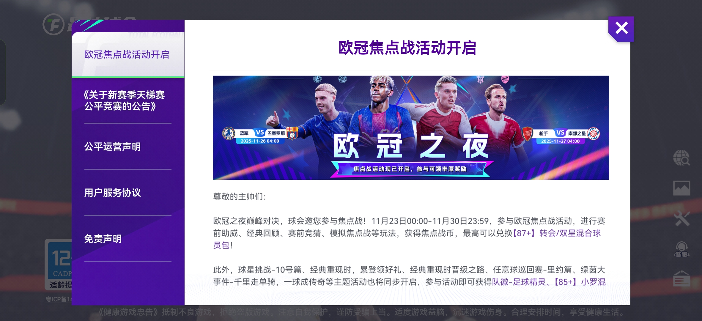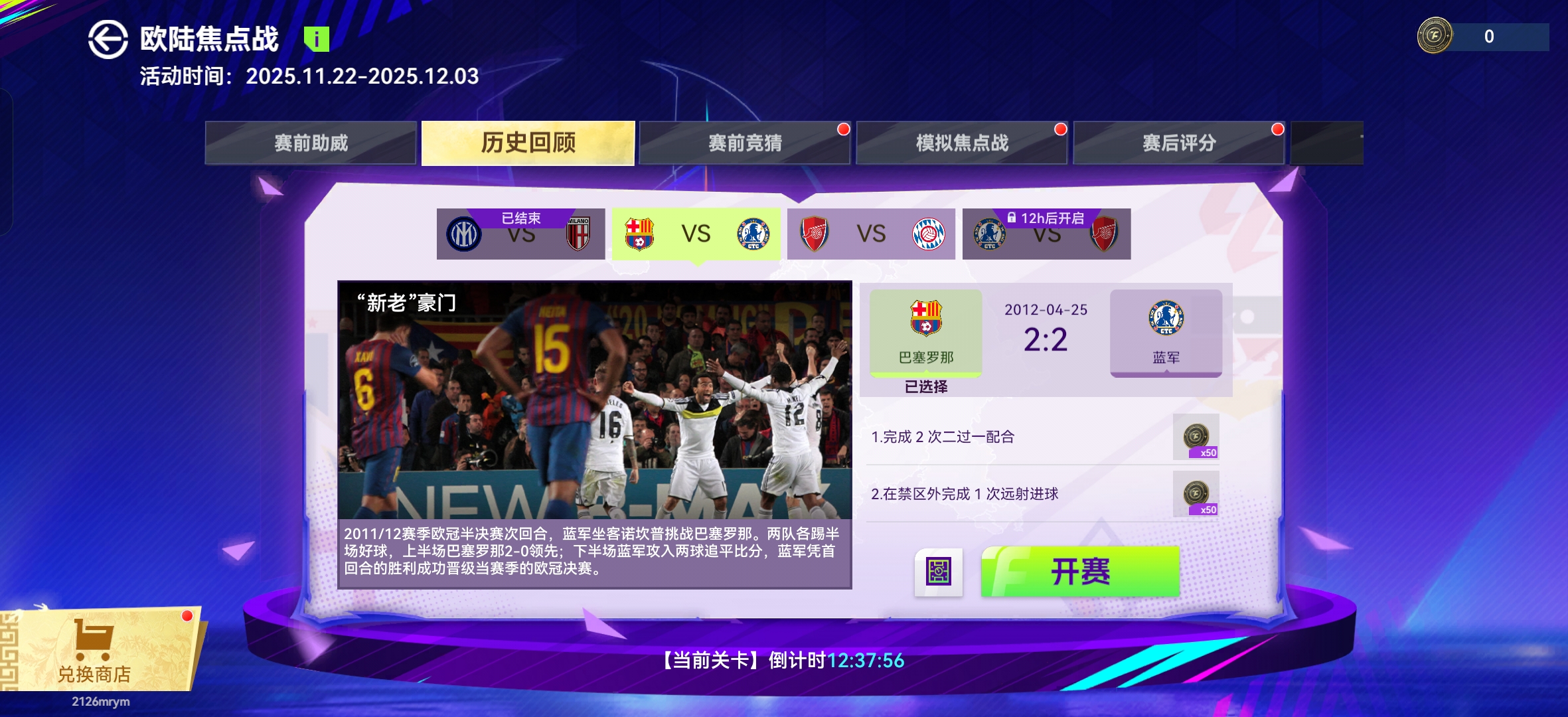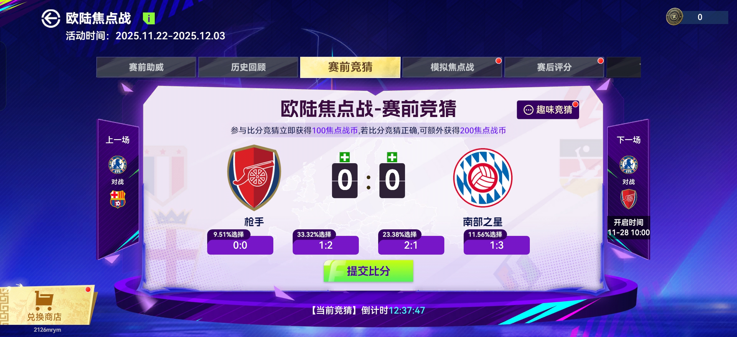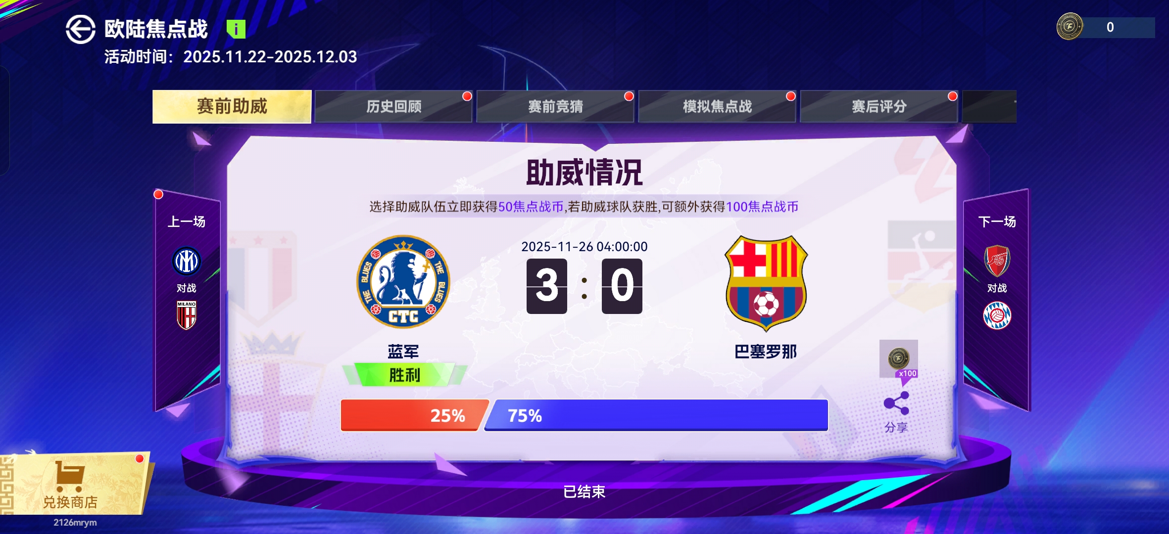 聊完实战再说说咱们游戏里的焦点战预测活动!这次切尔西3-0巴萨、曼城0-2勒沃库森的比分,有没有盟主精准命中?