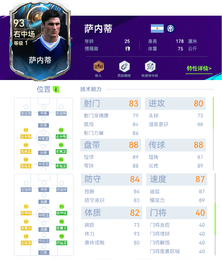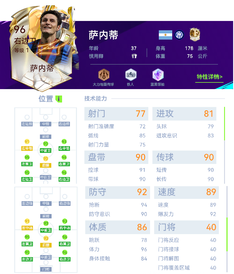 “永不疲倦的蓝黑超人” 哈维尔・萨内蒂,从 1995 到 2014,他是梅阿查永不停歇的发动机,是率国米拿下 2009/2010 三冠王的铁血队长,更是那件封存 4 号球衣里的忠诚信仰 —— 如今这位精神图腾登陆游戏,你觉得他在阵中最适配哪个位置?