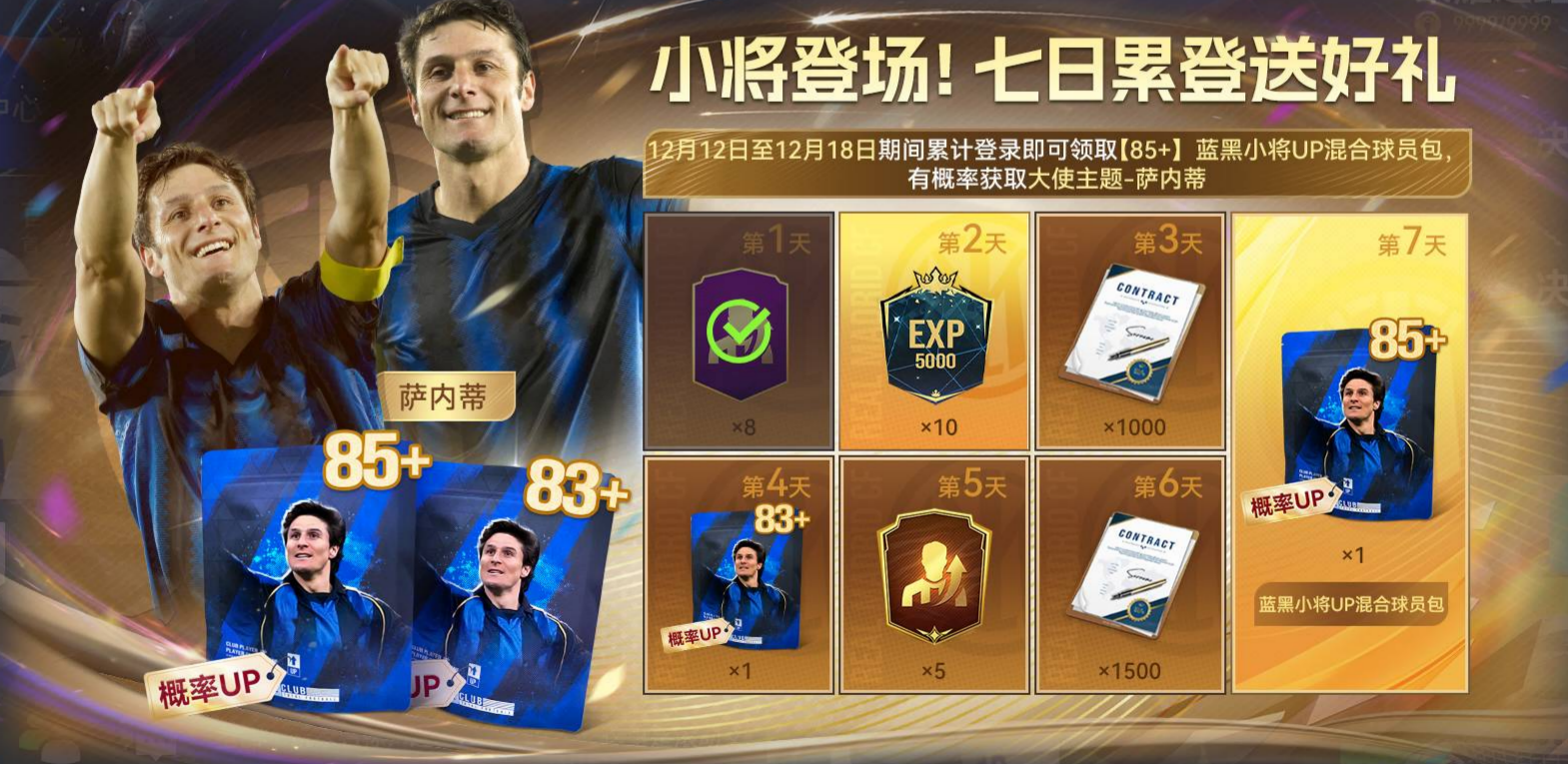 12月12日至12月18日期间累计登录可领取【85+】蓝黑小将UP混合球员包,有概率获取大使主题-萨内蒂。“蓝黑小将”降临球会,豪华奖励持续加码。每日签到不仅是习惯,更是与你的传奇并肩的第一步。参与活动,就有机会让大使萨内蒂加入你的阵容!