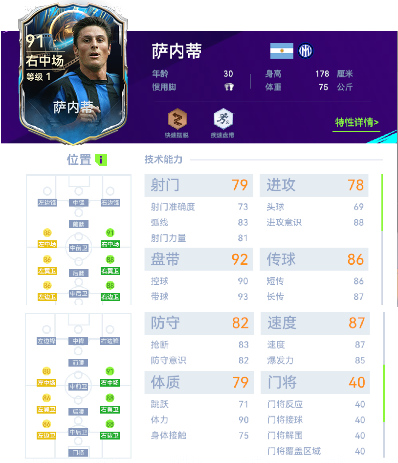 蓝黑领袖(专属特性):强化防守灵活性与抢断效率,提升边路拦截能力。