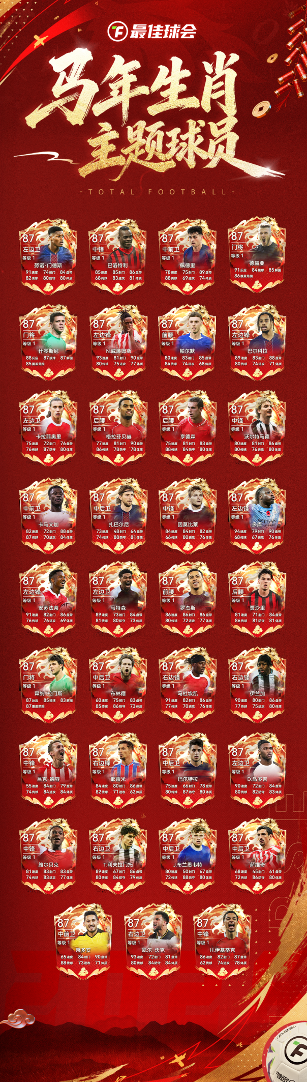赤马烈焰,燃动赛场!值此丙午马年,球会精选1990与2002年出生的优秀球员,首次打造87分生肖主题球员。帕尔默、佩德里的飘逸灵动,亨德森、巴洛特利的奔放不羁,正是“龙马精神”在绿茵场上的生动写照。
