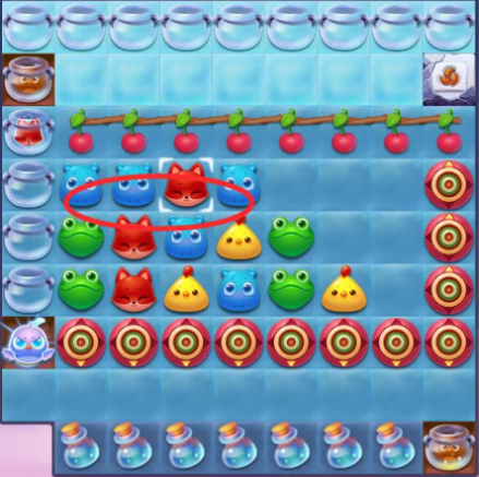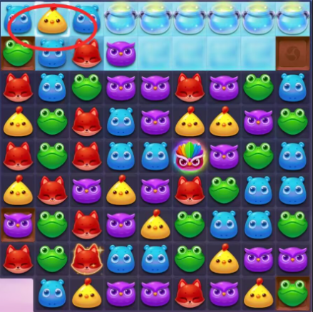 4:在豆荚下方进行三消消除,或者组合直线、爆炸特效等助力消除,配合三消消除豆荚下方动物,让豆荚向下掉落完成收集