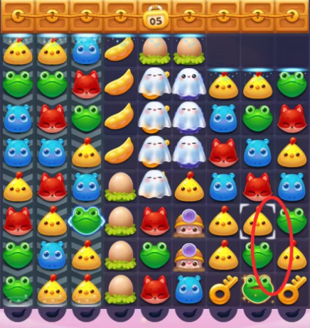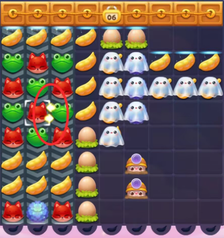 3:三消消除击打花团助力消除,或者直接击打幽灵宝宝让其上移,配合直线特效等助力消除豆荚下方的动物