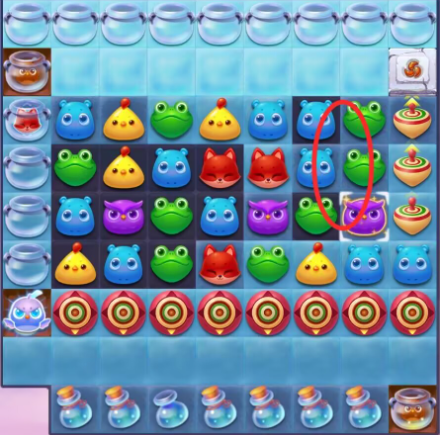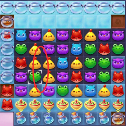 4:收尾时多采用旁消消除打破顶部魔法罐让动物掉落,同时留意周边组合直线、爆炸特效等助力消除,消除顶部剩余雪块