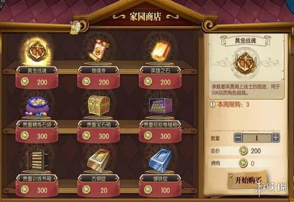 这里就看到了【家园商店】,我们想要的奖励就在这个里面,目前有;黄金战魂、搜魂券、英雄石、精炼石袋子、宝石箱等等资源。
