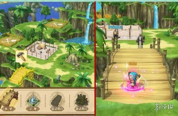 里面的建筑我们暂时不说了,不然篇幅会非常长,这里主要先看一下大体的玩法。上面的总览图界面,又出现了新的按键【装扮】。这个玩意就是让我们自己装扮家园的,目前可装扮的有小桥,还有一些景观。