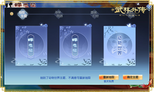 江湖风景如画,少侠们何不参与“蝶恋花”活动与CP增进情感?抽取主题,与小伙伴一起盛装打扮,获得高分,领取DIY的限时称号!装扮确认后,携手完成同游任务赢取梦蝶值,可用于兑换人气背饰、BT武器等奖励。