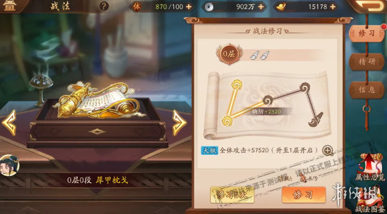 1、少年们可以在战法养成界面消耗养成材料对战法书进行养成,战法书的养成分为修习与精研两种。修习可提升战法书等级,获取属性加成;精研可进阶战法书品质,获得属性与技能强度的提升。