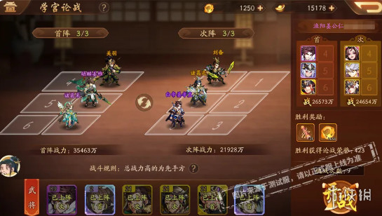 3、少年们进入玩法后,需要将上阵的六名武将分为为数3人的首阵与次阵,战斗进行2-3场,玩家和对手分别上阵各自的首阵和次阵进行对战;每场战斗开始后,回合数均重新计算。
