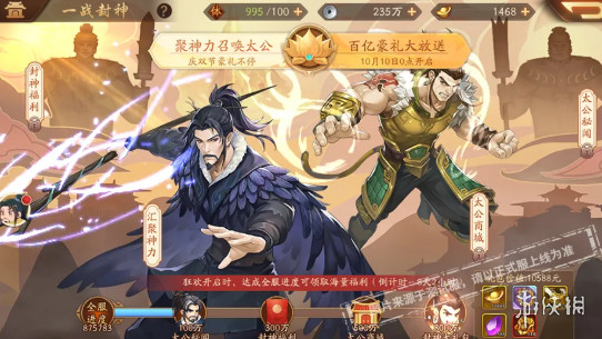 百亿联动豪礼少年参与活动,汇聚召唤太公之力,即可轻松获得“封神大礼包”:首个永久紫金称号、联动限定申公豹时装、10888元宝、武将118连抽尽收囊中!太公驾临,更有价值万元的太公礼盒馈赠万千少年,狂欢联动,百亿福利,限时开启!