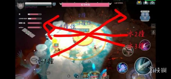 11.现在仇恨目标在下半场活动,因为火恶魔死了就不会放火球了,其余三个人站冰圈接应,等冰凤凰来撞,具体站位如下