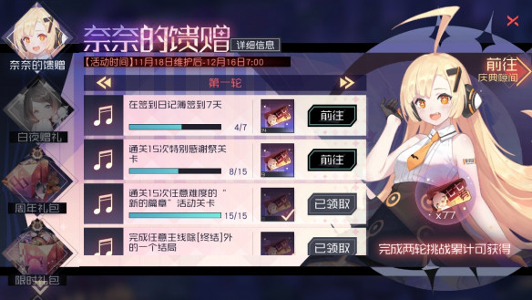 周年特别福利,丰富奖励与你敲响庆典钟声 周年庆期间,指挥使在指定日期登录游戏,可获得欧泊、沉扉券、灵魂核心等丰富奖励。此外,完成七七娘奈奈的挑战,将累计赠送77抽的丰厚奖励!