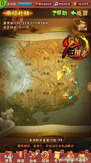 全新玩法“南征北战”为PVE模式,以赛季为周期开启,十三州每个州都对应一场历史战役,每场战役包含一百个章节,战胜每章将领后解锁下一章,并获得将领守护的宝箱。请谨慎选择你的行军路线前进,战胜战役统帅后解锁下一战役,每周日都将根据少年的战区排名发放奖励。同时,每周末开启血战模式,少年们将获得强化,开启更凶险刺激的战役!