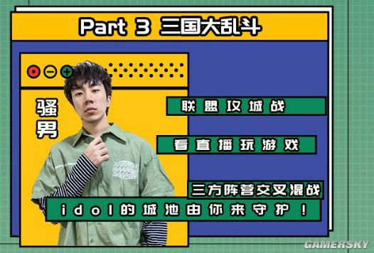四位明星嘉宾也是游戏圈的大红人,表面上是情歌暖男,实则是《乱世王者》资深玩家的胡夏与电竞女神小苍组成魏国“佛系联盟”;蜀国“欧气联盟”由骚话达人骚男与大神玩家组成,必将欧皇气势进行到底;套路满满的狼王JY与另一位大神玩家组成吴国“脑力联盟”。明星嘉宾的连番骚操作以及妙语连珠,当晚将能看到你的idol不为人知的一面!