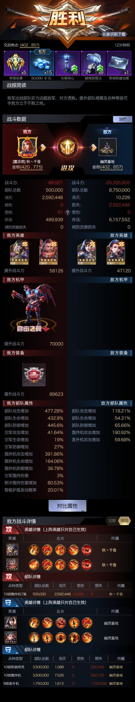 左侧的战报为装备科技研究之前的,右侧战报为装备可以研究之后的战报,都是对战37级幽灵基地的飞机。没有装备科技研究前,装备战力1483(最基本的7件紫色基础装备),装备科技研究后,装备战力达89623,提升了60倍之多,同样50万的出征,没研究前的杀敌数是1539434,研究后的杀敌数达到2592448,近1.7倍之多,同时战损数量也下降了2/3,这样惊人的提升展现了装备研究的强大实力,再结合只需采集就能获得的晶体道具消耗,这样的高性价比路线简直不要太划算!指挥官们,一起来研究装备吧~