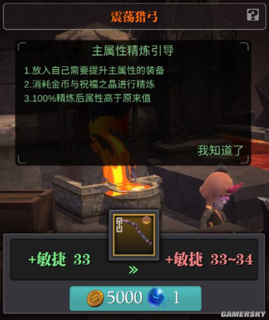 属性精炼就是指提升装备的主属性(力量、敏捷、智慧、体质),使用道具祝福之晶和金币可以让主属性提升到最大值。玩家20级时才可以解锁属性精炼功能。每次点击精炼必定成功,会在右侧的属性生成区间范围内随机生成一个大于现有主属性值的精炼数值,一定次数的精炼后一定会洗满主属性,主属性洗满后无法再精炼。