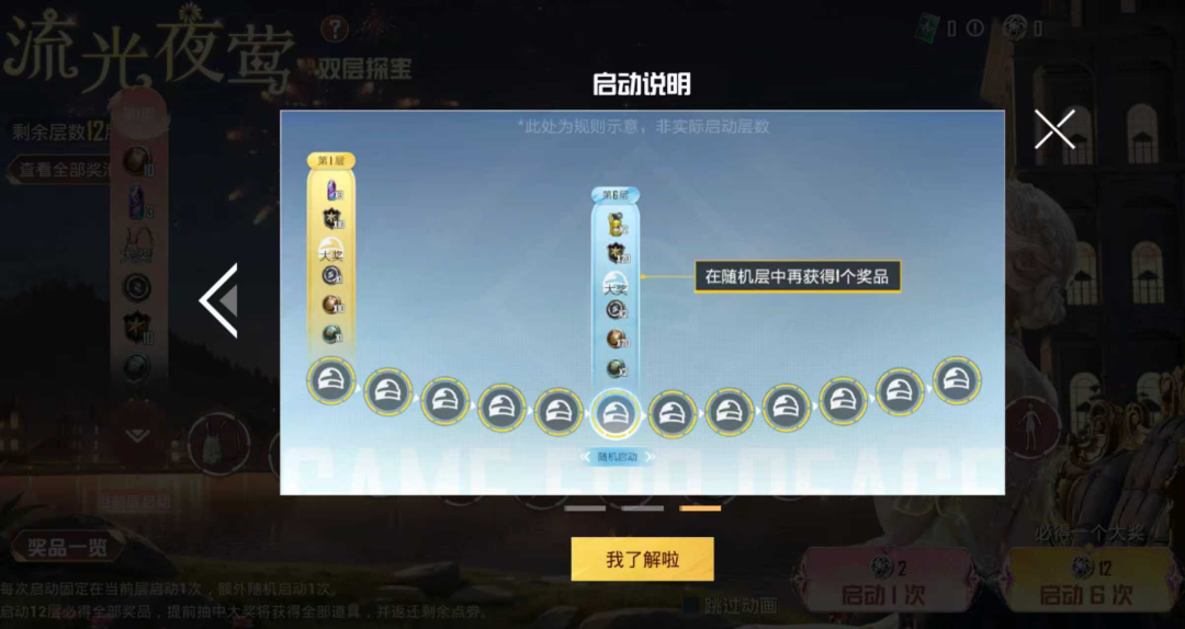 活动期间,每次启动,首先,您必定获得当前所在层的一个随机物品。随后,系统将从所有剩余层中随机选取一层,您将进入该层并再获得一个随机物品;