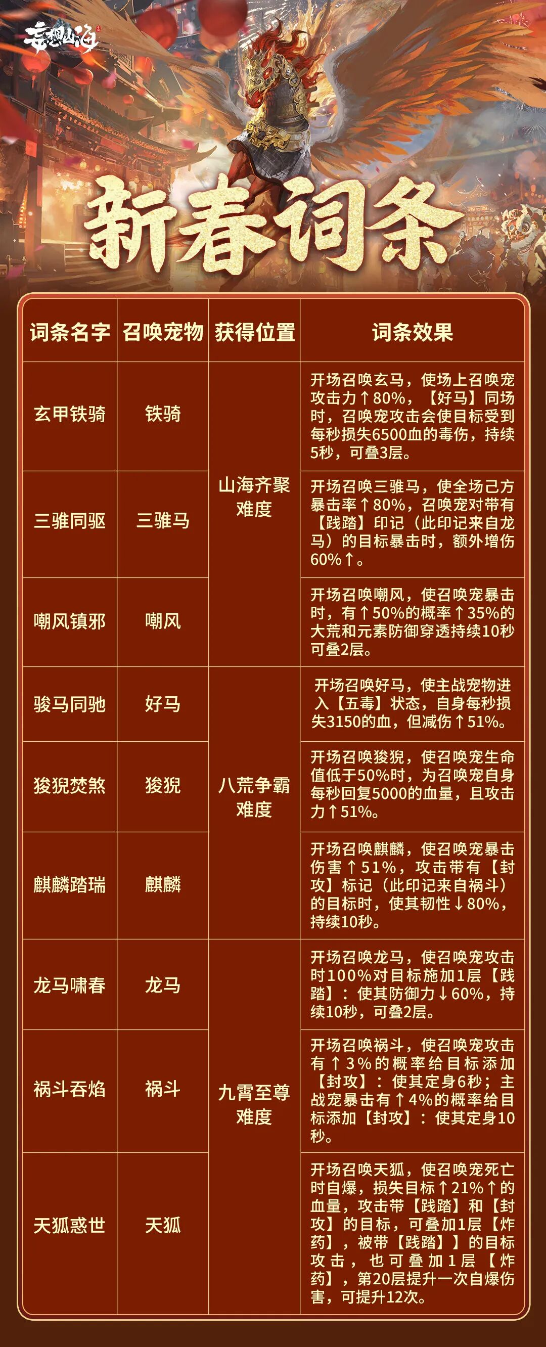 本次新春斗兽将有9种不同的词条,除了能召唤不同宠物之外,每种召唤词条还包含一种词条效果。