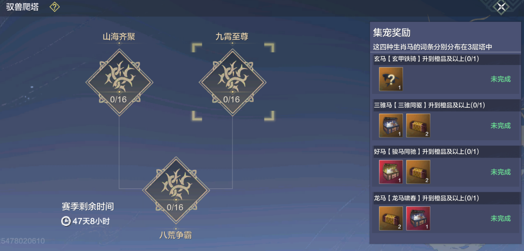 集宠奖励:收集四种生肖马的词条到橙色品质及以上,即可获得三万年好马(带鞍部的驮兽)或马老实元胎(开启自选包后可二选一)、三万年蜃兽随机包、万年蜃兽自选包等丰厚奖励!