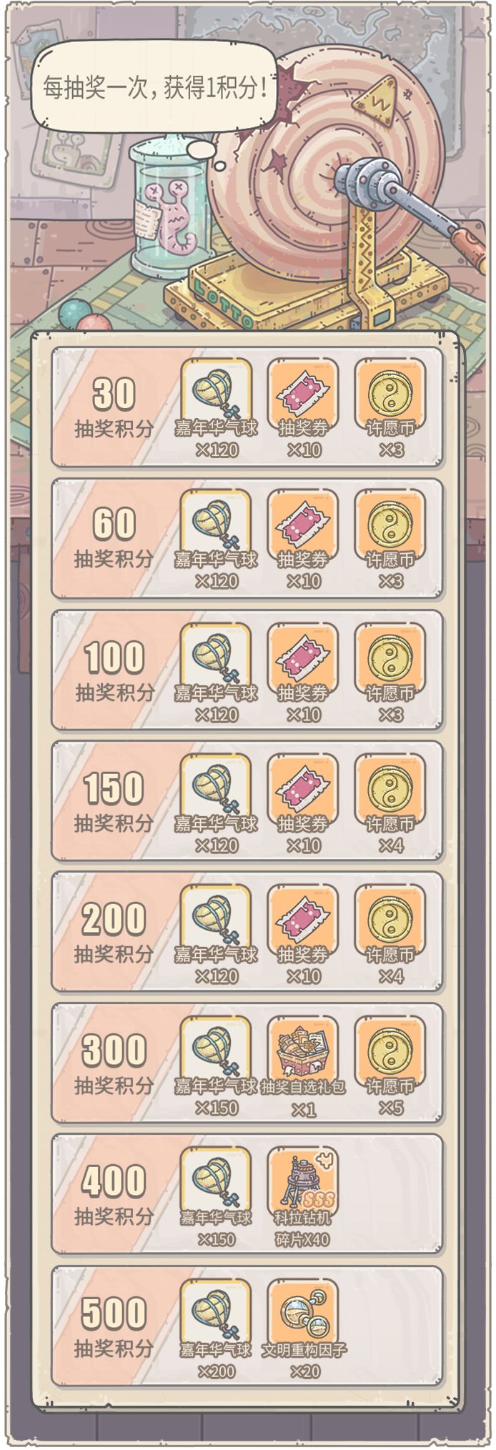 活动期间,每进行1次抽奖,可获得1个积分。累积对应的活动积分,可获得以上奖励。