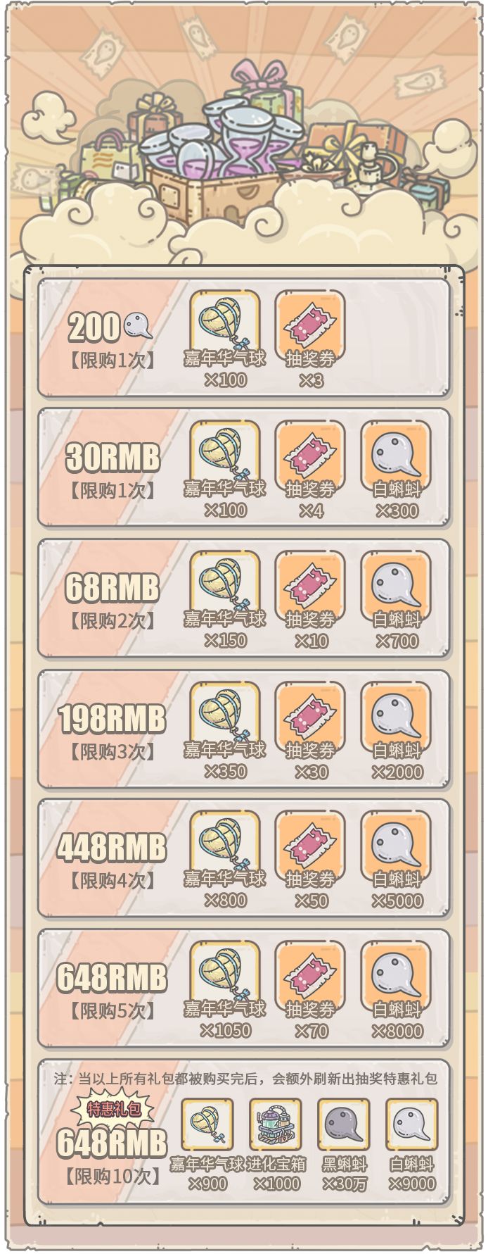 内容为:白蝌蚪×20、抽奖券×3、嘉年华气球×100