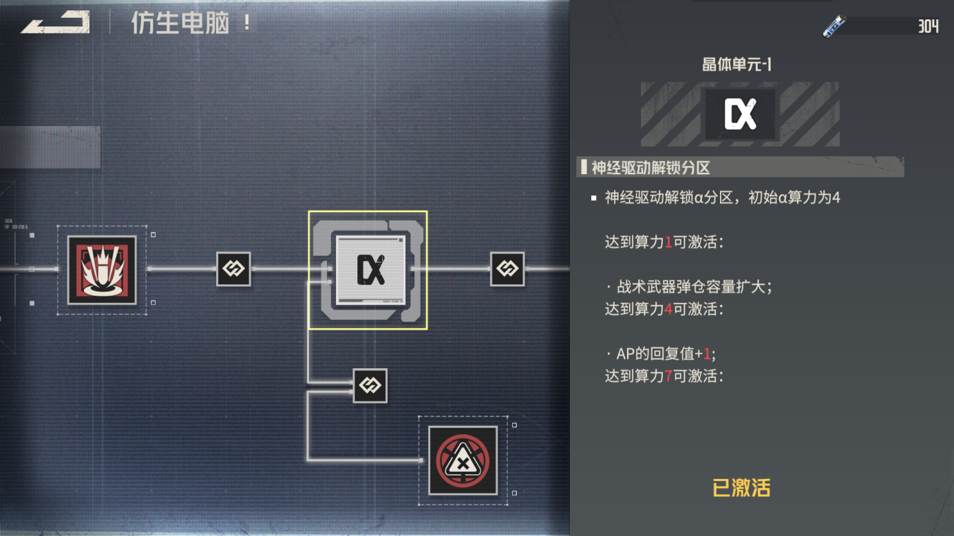 激活晶体单元可以解锁神经驱动中对应分区,解锁后机师可以在神经驱动中插入芯片获得芯片加成,并在分区达到一定算力后获得相应的强化。