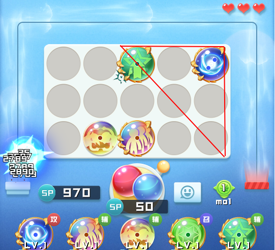 在实战中,理想的情况就是像下图那样,让元气球尽量合成在战场右上角(红框区域),将怪物消灭在出生地附近,从而形成压倒性优势。