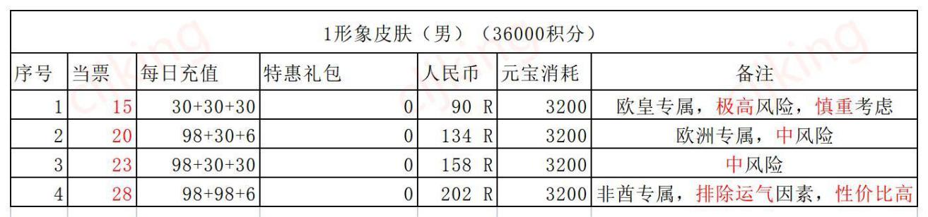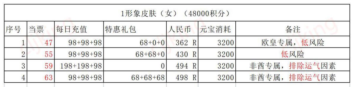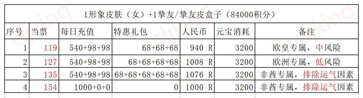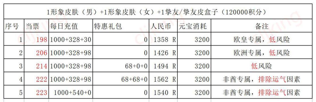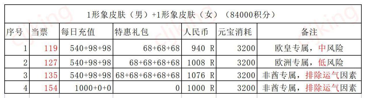 二、目标与氪金方案(第一天14点停止使用体力,存的体力和当票都在第二天用;不考虑触发体力恢复事件;凑累充方面,大家在以下氪金方案中自行考虑)