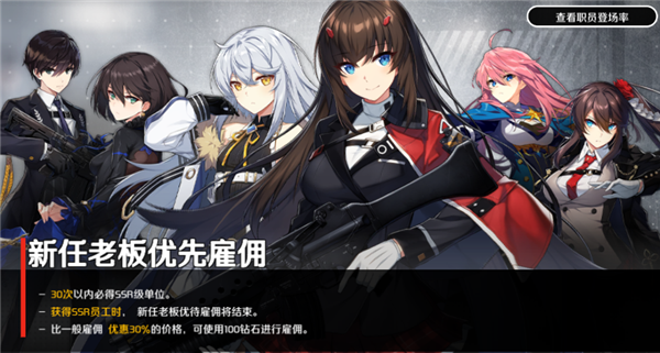 为扶持新公司成长,管理局为新任老板准备了优先雇佣,30次雇佣必获得一名SSR职员,更快地帮助老板投入异界战场,占领战斗先机,击退侵蚀体的入侵。使用此优先雇佣可享受比一般雇佣优惠30%的价格(仅需消耗游戏内钻石)。