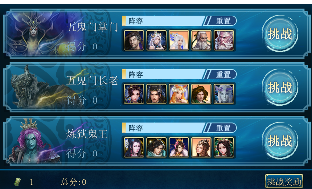 ​在首领挑战中,各位剑仙可以使用3队散仙挑战3个首领敌人,在3场挑战中,使用的散仙不可重复。每场挑战胜利后,根据使用的行动数获得对应的积分,使用的行动数越少,获得的积分越高;