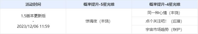 本期光锥活动跃迁时间为 2023/11/15 1.5版本更新后 - 2023/12/06 11:59 ,包含如下内容: