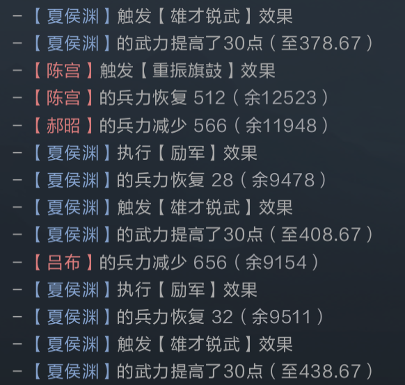 如图中所示,第一张图中夏侯渊释放出敌不意,首先到来的全体伤害共计算了3次【负弩摧舟】效果。而负弩摧舟的描述为“每造成一段伤害提高10%暴击率”,所以实战中夏侯渊发动技能后,全体伤害在计算到第二名敌人时就可以将负弩摧舟叠加满层,极大的提升了后续技能的暴击效率。
