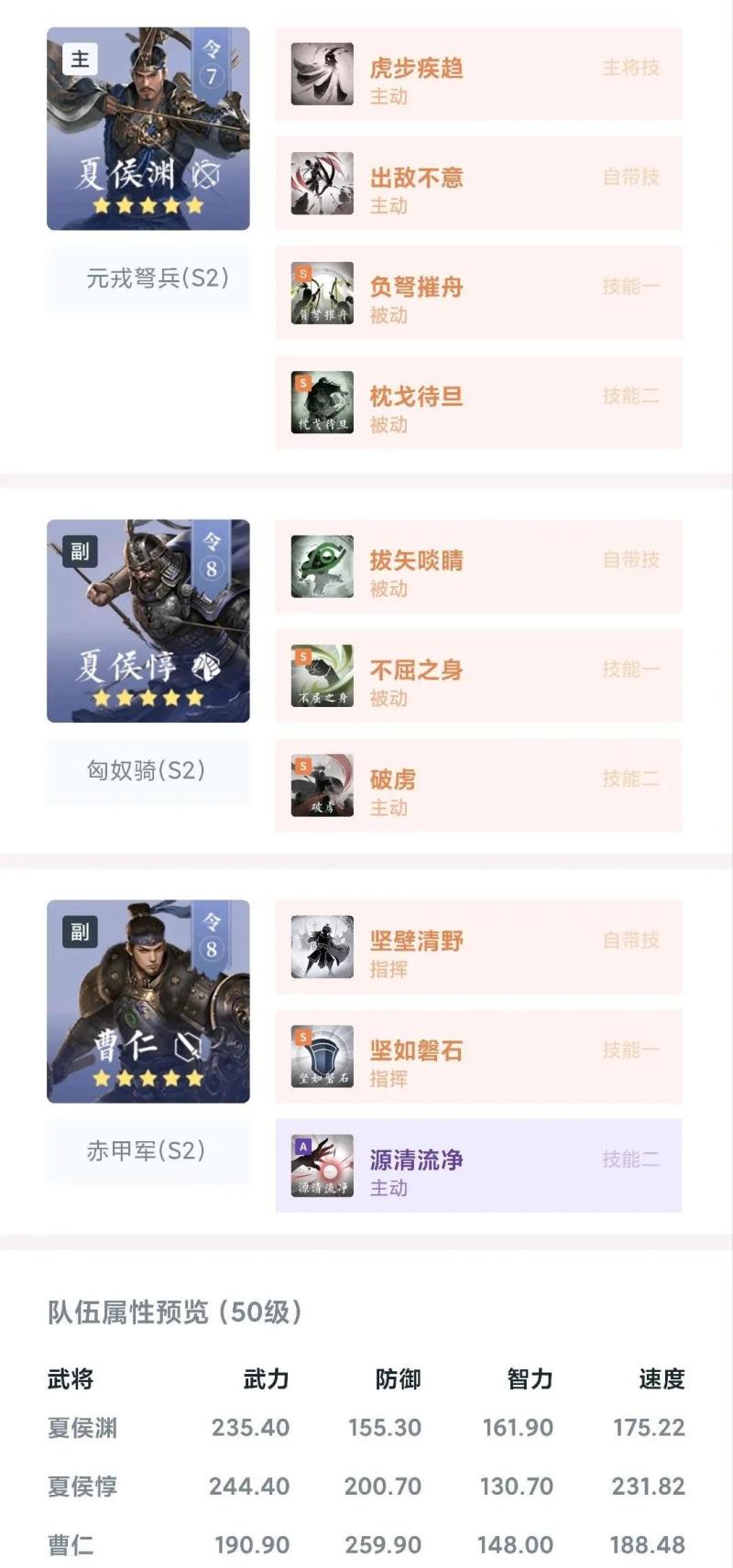 该阵容主打驻守反击,利用曹仁+夏侯惇双前排模式可硬抗大多数爆发队伍,让夏侯渊在后排安心输出,整体坦度和伤害都非常高。如果追求极致爆发,可以尝试搭配董卓/袁绍/刘备等组成合聚队。