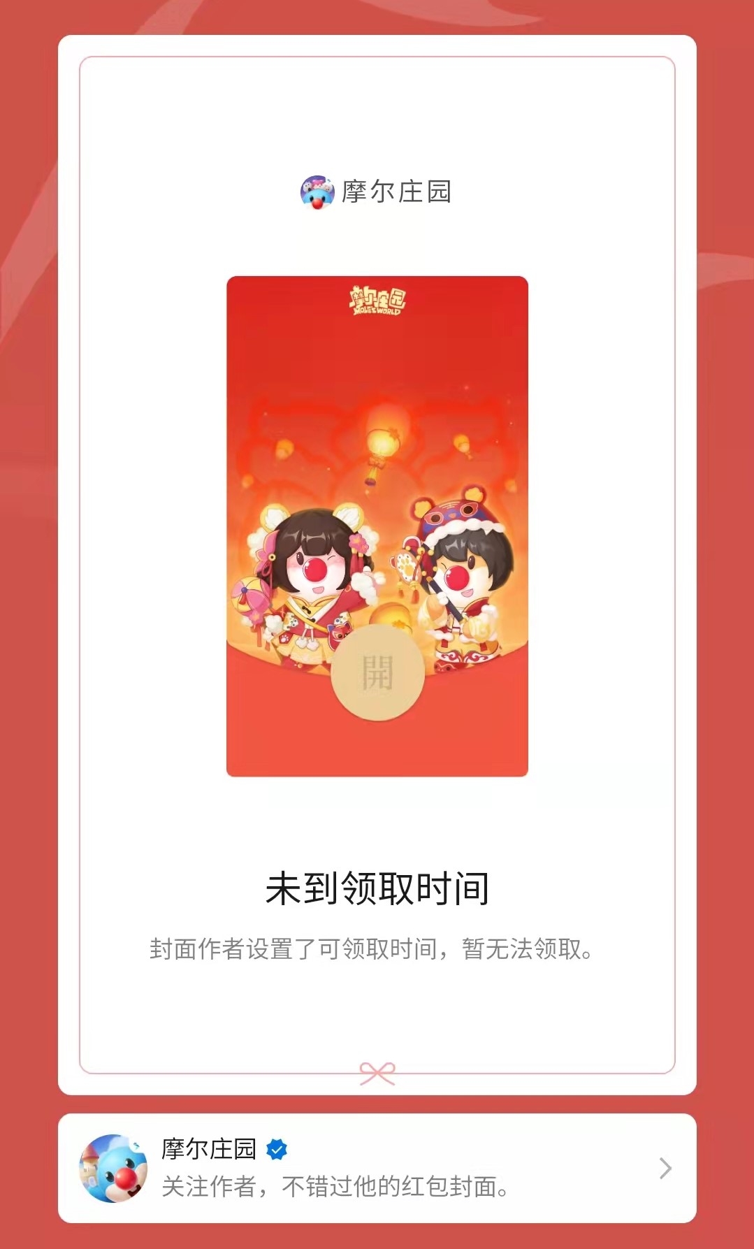 每天的红包封面系统设置在14:00准时发放,不过小摩尔们要注意啦,经过多次测试后发现可能会存在0.5-1分钟左右的延误。如果领取失败的话,可以退出界面重新尝试领取哦。