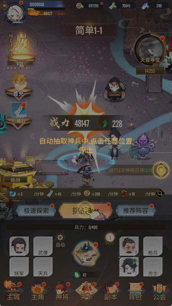 • 挑战心魔试炼:获取神将升级材料,每关还能得“仙豆”抽神兵(快速提升属性);
