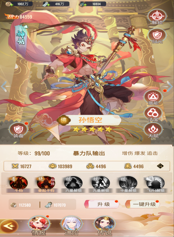 三界神将集结,策略定乾坤:上百名仙、魔、妖、佛、时空阵营神将悉数登场,孙悟空、蚩尤等顶级输出一键上阵,前后排羁绊自由搭配,无损重置阵容让策略随心切换,零氪也能组建专属强队。