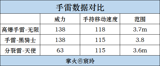 同时该投掷的整体数据与雷神手雷相持平,更是比分裂雷-天使的基础数据高出一大截,同时在便携方面也是远远优于黑骑士手雷,整体而言是一款物美价廉的英雄级投掷,以下即为三款武器的数据对比。