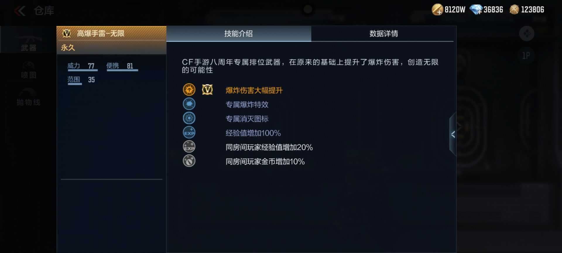 在属性方面,高爆手雷-无限拥有爆炸伤害大幅度提升这一非常实用的属性,其基础伤害高达138点,高额的爆炸伤害往往可以在对局中的小道等狭窄区域造成十分强大的杀伤力!