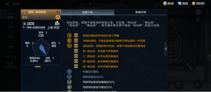 9A91-诛仙四剑作为9A91系列的最新英雄级,也成为了这个系列的佼佼者。属性方面除了装备后增加所有背包步枪子弹数之外,还拥有冲锋枪弹匣属性:可接受英雄级冲锋枪子弹加成的一半效果。这款武器最重要的属性便是切换剑匣中的剑,可获得不同部位伤害的加成。利-诛仙剑:命中躯干伤害强化、亡-诛仙剑:命中头部伤害强化、困-诛仙剑:命中腿部伤害强化、绝-诛仙剑命中手部伤害强化。诛仙四剑的专属技能,让这款武器的实战能力大大提升。