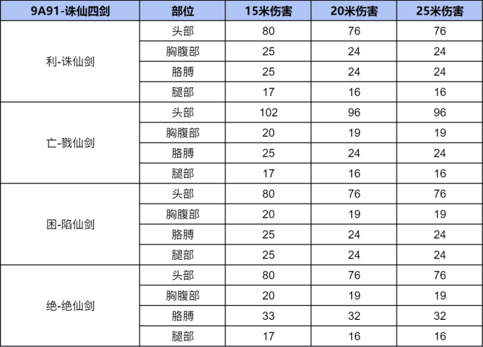 以靶场为例,15米、20米和25米距离的伤害测试如下图,可以很清晰的了解到9A91-诛仙四剑切换四种模式下的伤害有很明显的不同,在实战中各位CFer可以根据自己的实战情况选择切换属性。