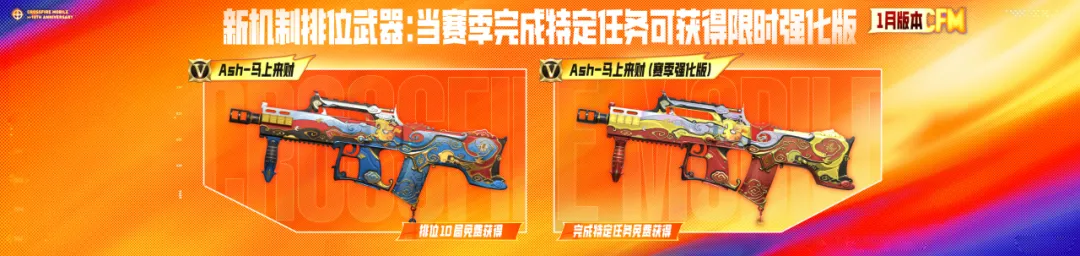 1月份,我们将更新新的排位赛武器ASH-马上来财,也是呼应了我们马年设计,在这里提前给大家拜个早年,同时呢这次我们不再是觉醒机制,而是进化机制,完成赛季任务,获得强力的赛季强化版,为大家带来新的体验!