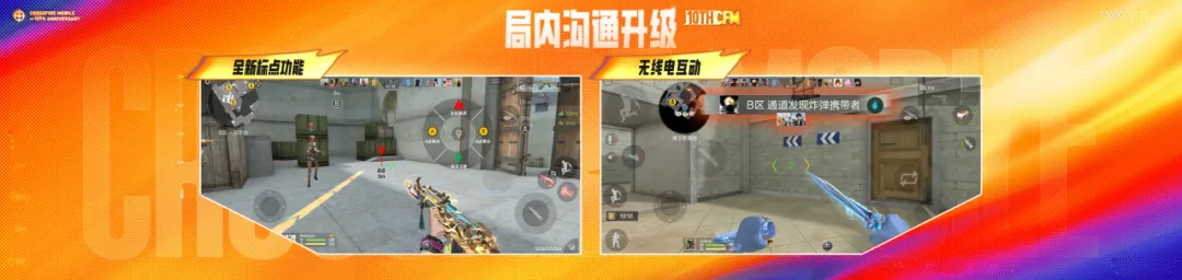信息,始终是游戏中决定胜负的核心。为了提供更顺畅的沟通,我们将为局内交流带来全新功能,首先,我们新增了地图标点功能。在对局中,您可以快速标记敌方动态并发出战术指令。比如说,在敌方RUSH b时,可以通过标点来快速呼叫队友协助。与此同时,全新的无线电互动功能,将提供可回应的双向交流。当CFer们发出冲锋指令时,能清楚的知道队友就站在你的身后。
