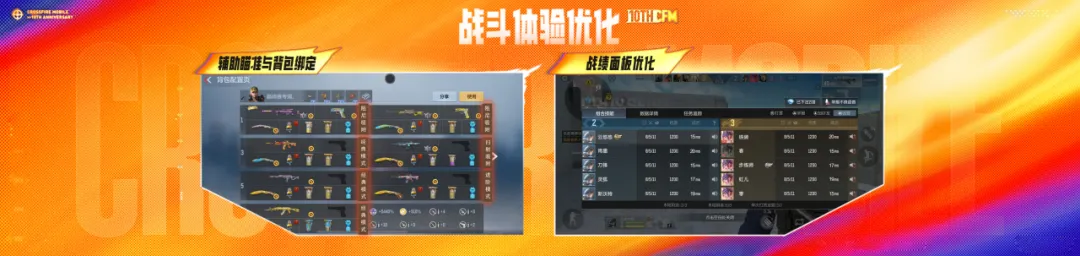 在新竞技功能上,我们将带来辅助瞄准与背包绑定局内战绩面板刷新。首先,辅助瞄准与背包绑定,可以让CFer们为不同背包中的武器分别选择最适合的辅助瞄准方式。例如狙击枪选择阻尼吸附,步枪选择经典模式,让局内切换背包时更加得心应手。另外我们还将刷新局内战绩面板,在原有的消灭、阵亡基础上新增助攻和伤害信息,让战斗中每一位CFer的贡献都能得到体现。
