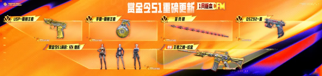 1月份,我们新的S1赏金令更新,不仅有雷暴王者系列的新品USP-雷暴王者手雷-雷暴王者,同时大家期待的盖套装也来了,QSZ92-盖苦肉鞭将助力喜欢盖的玩家们征战沙场。除此以外我们的老朋友炫金皮肤系列王者之魄-炫金也将登场,当然了本次我们也为大家准备了新的赏金令角色-魅影,也是一个CF经典IP角色,希望大家能够喜欢。