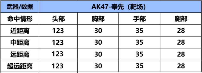 在靶场对AK47-元让进行了伤害测试,实际情况击中头部、胸部和手部以及腿部完全没有距离衰减,这一点在实战可谓是如虎添翼,因为我们在多数狭长的大道对枪时总会差最后一点伤害击杀敌人,而伤害无距离衰减就可以避免这些尴尬的情况出现,两枪护甲一枪手即35+35+30=100,大大提升了对枪体验,而且AK47-元让继承了AK系列的超高伤害,击中头部的伤害高达123,残血反杀不在话下。
