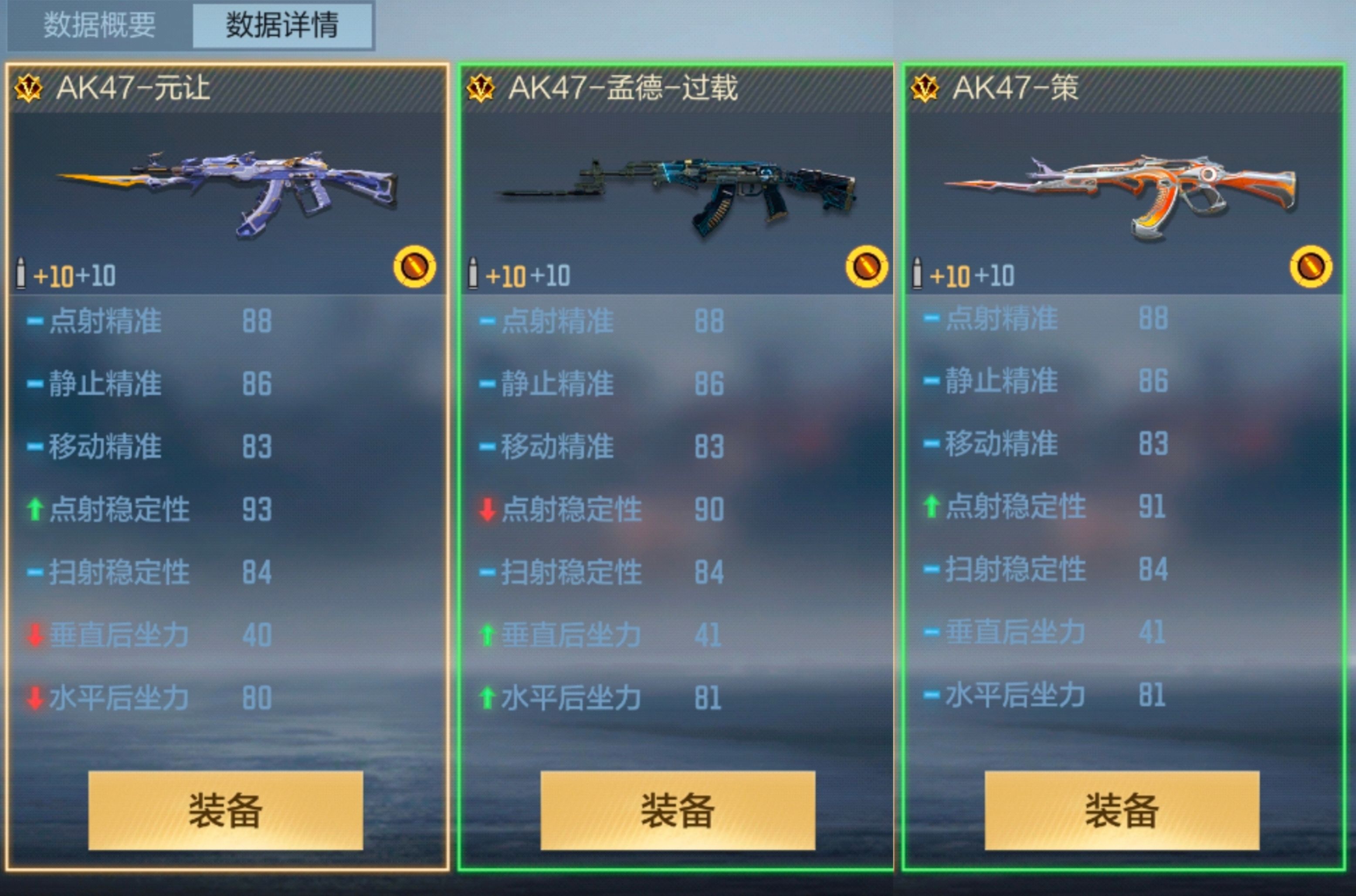 接下来看操作数据对比,三款武器在点射精准、静止精准、移动精准、扫射稳定性和受击上抬高度数据一致,点射稳定性AK47-元让尤其突出,可不要看这里只比另外两把枪高出2-3点,但是这个数据体现在实战中是会被成倍放大的,非常的优秀!并且手持AK47-元让受伤后受击上抬高度会从0.4变为0!