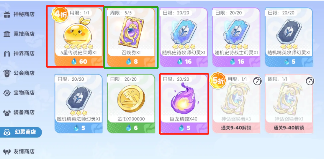 推荐优先兑换:5星传说史莱姆(合成材料)、巨龙精魄(突破材料)